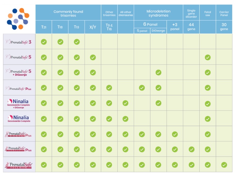 Our NIPT tests have clinical performance data in millions of pregnant women published in clinical journals. With comprehensive genetic information, a broad screening test includes the following numerical and/or structural abnormalities, microdeletions, de novo mutations, fetal RH incompatibility, genetic disorders at the level of individual genes in the fetus, and more by analysing cell-free foetal DNA (cffDNA) circulating in maternal blood.